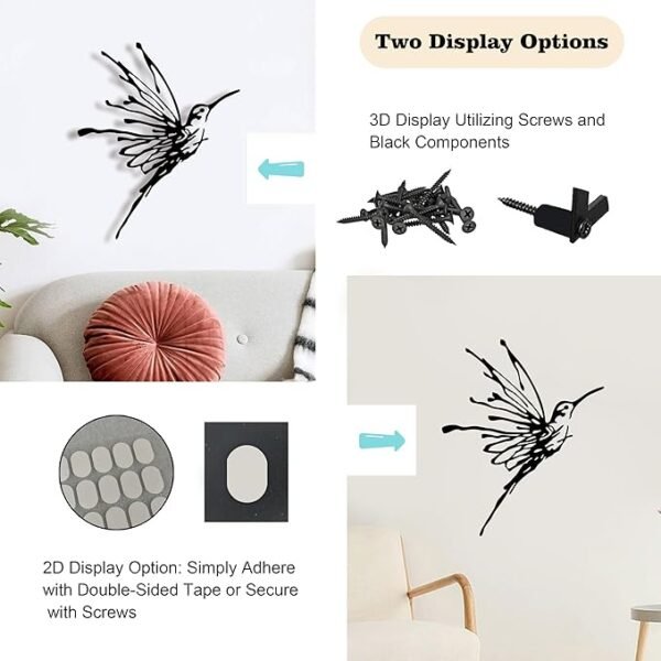 Elevate your décor with the 3D Metal Hummingbird Wall Art — a striking, weather-proof metal sculpture designed to add charm to indoor and outdoor spaces alike. With its hollow-cut 3D design, the hummingbird motif casts beautiful shadows and adds depth, creating a dynamic visual effect on any wall. Amazon