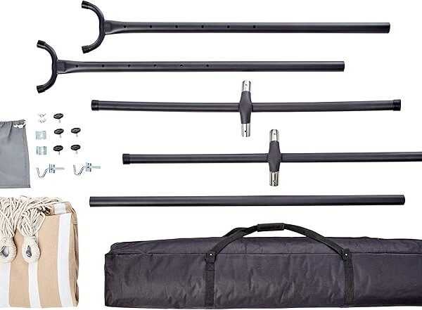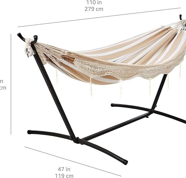 Transform your backyard, garden, or balcony into a cozy retreat with the Amazon Basics Double Hammock with 9-Foot Steel Stand. Designed for convenience and comfort, this hammock set includes a durable hammock made from soft cotton-poly blend and a robust, space-saving steel stand — so you don’t need trees or posts to hang it. amazon.com+1
