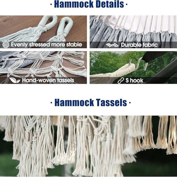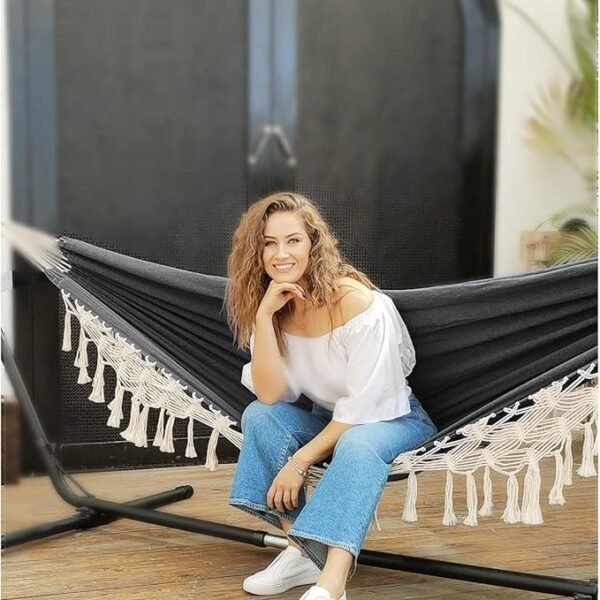 Relax outdoors with the Anyoo Cotton Hammock — a soft, breathable, and durable double hammock with elegant tassels and up to 450 lb capacity. Portable and easy to hang on trees, beams or stands — perfect for patios, gardens, balconies, or porches.