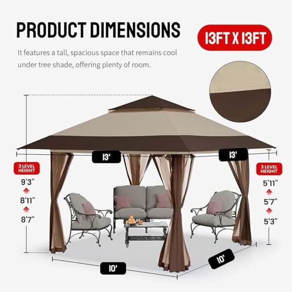 Enjoy instant, spacious outdoor shelter with the CROWN SHADES 13×13 ft Pop-Up Gazebo — a versatile canopy built for patios, backyards, beach trips, picnics, events, and more. Its patented “center-hub” one-push setup lets two people raise or collapse the tent within minutes — no tools required. Amazon