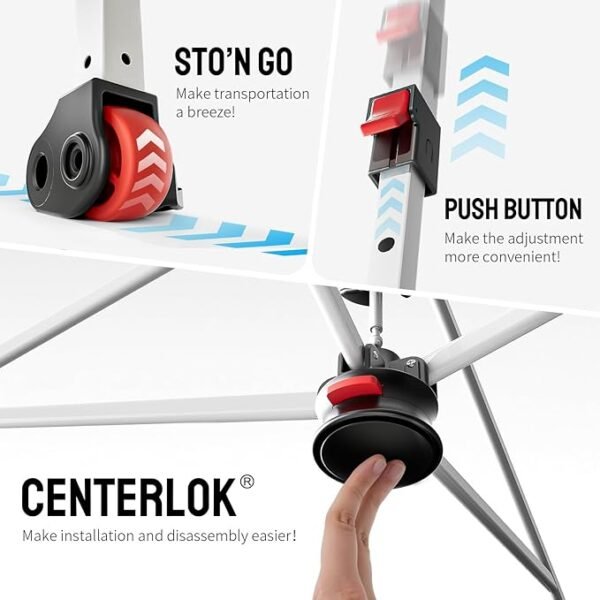 The sturdy alloy-steel frame supports up to 150 lbs and ensures durable, stable structure. The package includes a wheeled Sto-’N-Go carry bag, stakes, guy ropes, and weight bags — so you can transport it easily and set it up on lawns, patios, beaches, or camping spots. Amazon