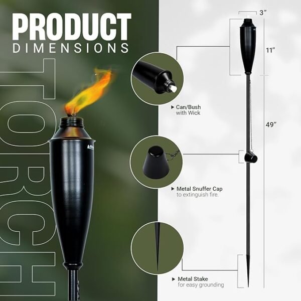 Each set includes four torches, complete with long-lasting fiberglass wicks, metal snuffer caps for safe flame extinguishing, and grounding spikes for easy installation on various terrains. Amazon