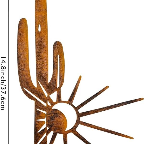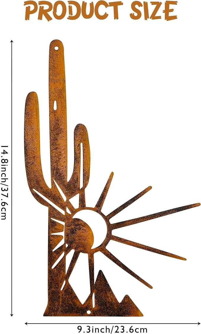 Measuring 14.8″ × 9.3″, this saguaro-cactus shaped art piece is compact yet eye-catching — perfect for homes, cabins, cottages, or desert-style outdoor spaces. Amazon Its rugged metal build ensures durability against weather and time, while the rustic finish adds character and warmth to your décor. Amazon
