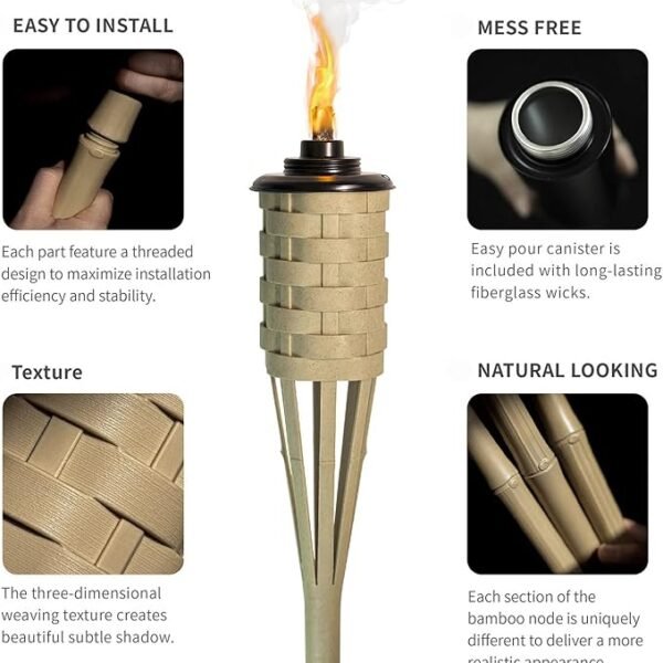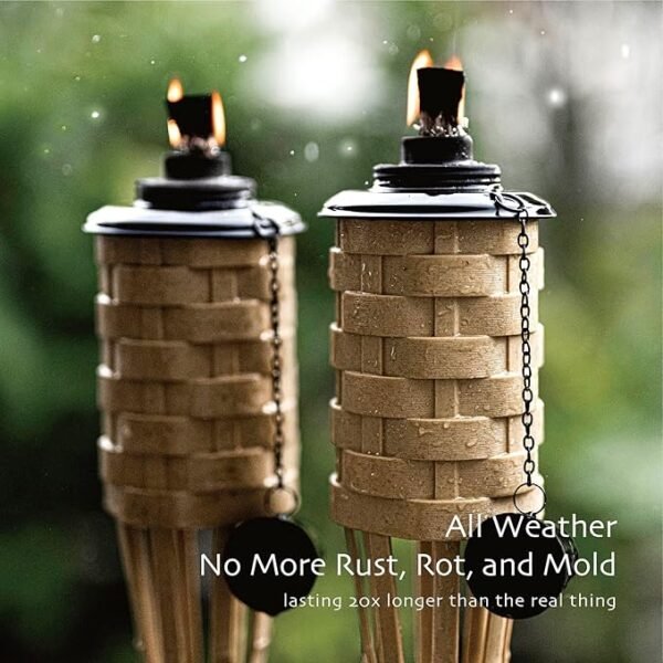Enhance your outdoor space with the ONETHATCH Bamboo Outdoor Citronella Torches (4-Pack), designed to deliver a warm, tropical-style glow and functional illumination for gardens, patios, pathways, or backyard gatherings. Constructed from a durable blend of natural bamboo fiber and recycled plastic, these torches are weather-resistant and UV-treated — so they resist rot, rust, and mold even under humid conditions. Amazon+1