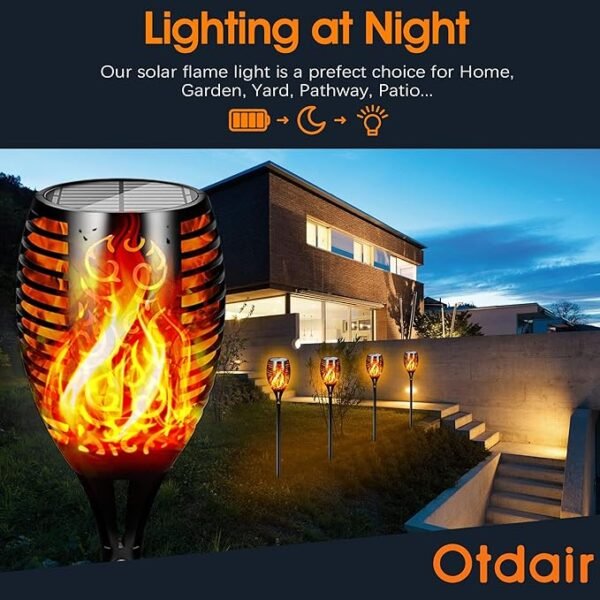 Transform your yard, garden, patio, or pathway with the Otdair Solar Flickering Flame Torch Lights (4-Pack) — an easy, eco-friendly way to add cozy, flame-like illumination to your outdoor space. Each torch features 96 LEDs that mimic the warm glow of a real flame, creating a soft and inviting atmosphere without smoke, heat, or open fire. Amazon
