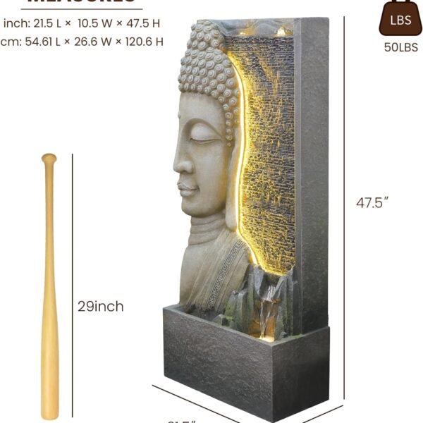 This impressive fountain stands about 47.5 inches tall (≈ 120.7 cm), making it a striking focal point for any outdoor area — yet sized appropriately to fit patios, decks, or backyard corners. The realistic Buddha statue design and stone-look resin finish add a touch of Zen-style artistry that blends beautifully with greenery, rocks, or water gardens. Amazon