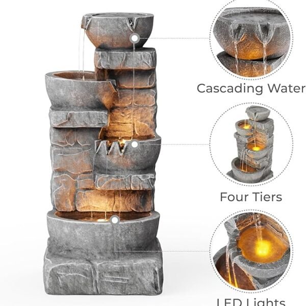 Water flows gently from bowl to bowl along the cascading tiers, creating a continuous waterfall effect that helps mask noise, soothe the mind, and elevate the ambiance of your garden, patio, or balcony. The built-in LED lights cast a soft glow at night, turning any outdoor setting into a cozy, inviting space for evening relaxation or outdoor gatherings. Amazon+1