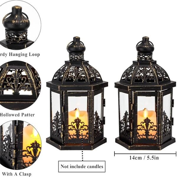 At 9.5″ in height, these lanterns are compact yet striking; they can be hung from porch beams, patio hooks, garden fences, or placed on tables to create a warm, inviting glow. Whether used as welcoming porch lights, mood lighting for garden parties, or rustic home décor, the vintage metal-glass design adds a touch of classic style to any setting. Amazon+1