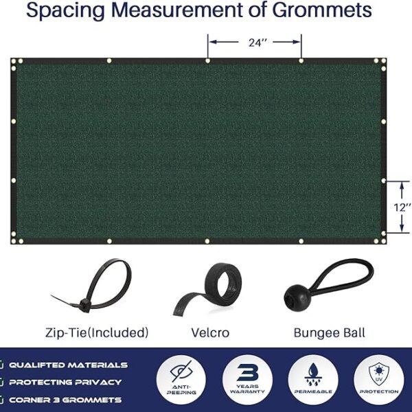 The fabric is tightly woven yet breathable, designed to resist tearing, stretching, and weather exposure. Reinforced stitched edges and brass grommets on the border make installation simple: just unroll the mesh and fasten it to your existing fence or railing with zip-ties or ropes (often included). Amazon+1